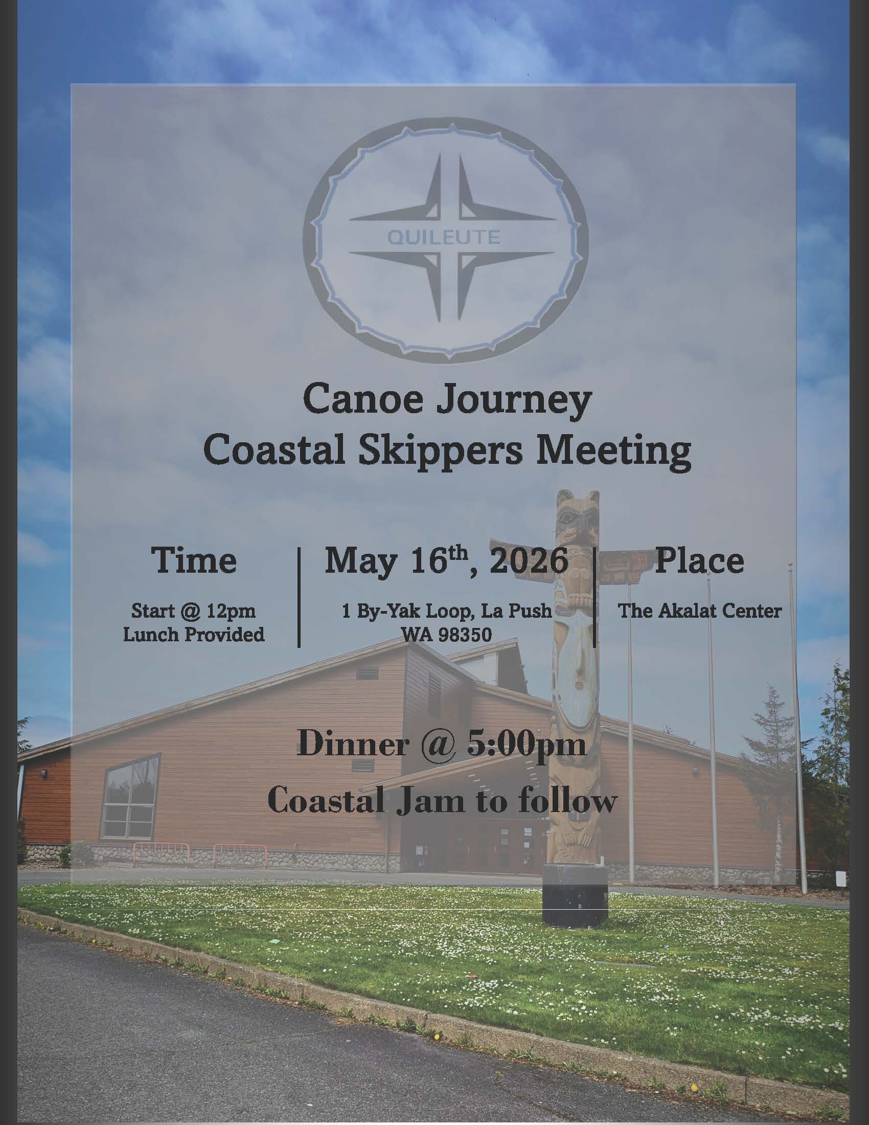 Canoe Journey Coastal Skippers meeting. @12pm lunch Provided @5pm Coastal Jam to follow.