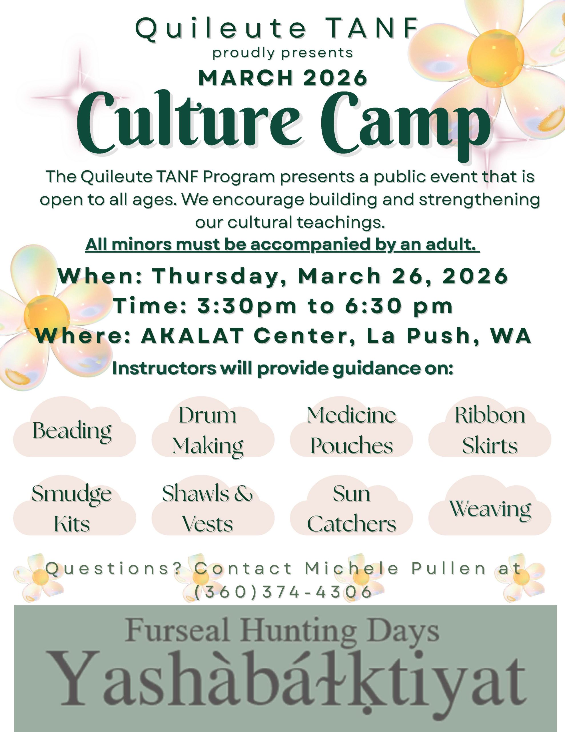 Culture camp, come share culture making: drum kits, sage sticks, suncatchers, cedar weaving, shawl and vest making, beading, kids bead making,