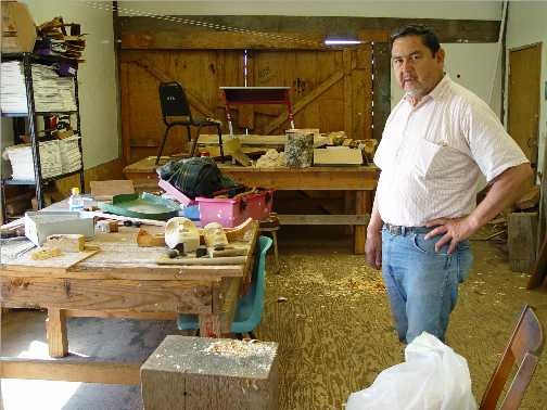 Chris Morganroth, III, currently a member of the Quileute Tribal Council, often teaches carving at the carving shop on the Reservation.