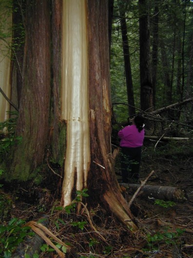 Marie Riebe stripping a narrow band of cedar bark